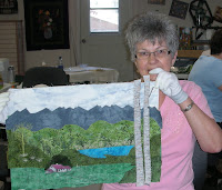 I then pieced some blue, turquoise and purple batiks to make the stream and laid it on the white. I cut another piece of white and made the snow on the left. I then put in some shadows with a fabric pen. (I will do more thread painting once the scene is together). I placed some rocks in the stream and thread painted some white water around it. (I will do more of this but want to get the scene together before I finish the thread painting) I am now in the process of working on the trees and the mountain in the distance - (I will use some white thread to paint some snow on the peak. I am enjoying doing this small